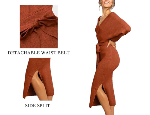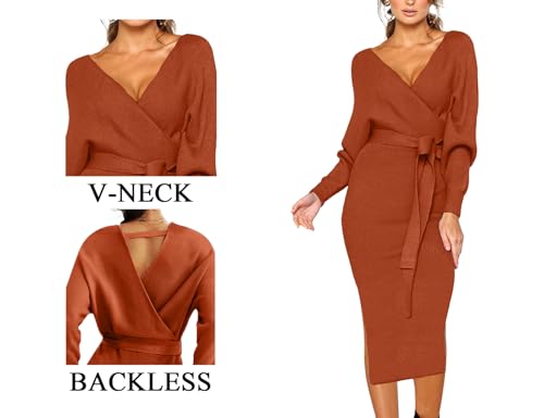 CHERFLY Women's V Neck Sweater Dresses Batwing Long Sleeve Backless Bodycon Long Dress with Belt 4