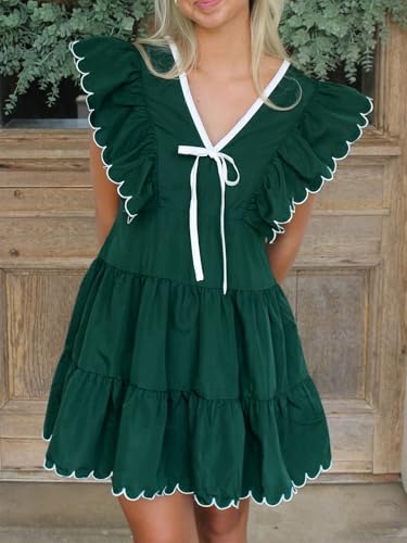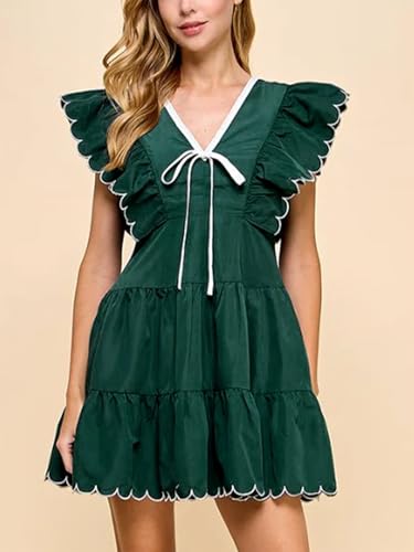 • Design: V-neckline with bow detail dress with scalloped poplin ruffle sleeves. Featuring a tiered skirt with a scalloped hem, a contrast color trim and concealed back zipper. Women ruffled mini dress, v neck bowknot dress, ruffle sleeve tiered dress, short babydoll dress for women, contrast trim short dress, tie-front tiered mini dress, summer casual party dress, cute summer mini dress