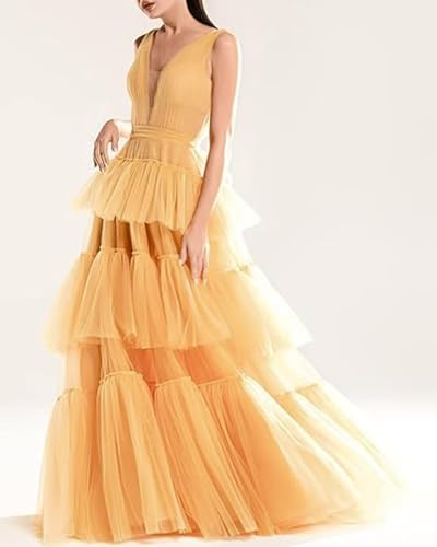 • Features: Tiered tulle prom dress long ball gown double v neck a line ruffle formal dresses prom gowns for women, floor length, fully lined, build-in bra