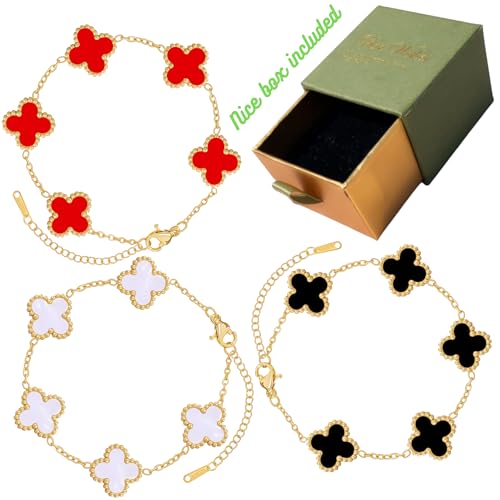 Clover Bracelet Set of 3 for Women White/Black/Red Adjustable Link Double-Sided Lucky Bracelets Trendy Bracelets Set Jewelry Gifts for Women 3