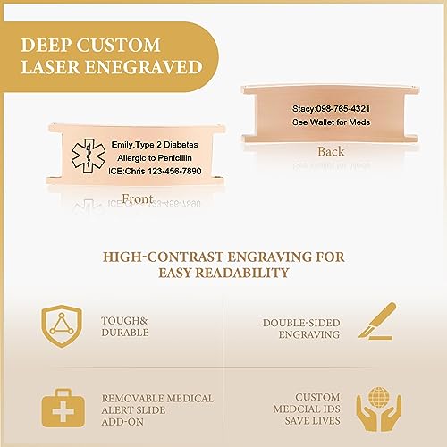 • Come with a Medical Id Card: Front and back availability for medical and emergency contact information, and carry them in your wallet. In an emergency, when you might be unable to speak for yourself, a medical ID bracelet speaks for you.