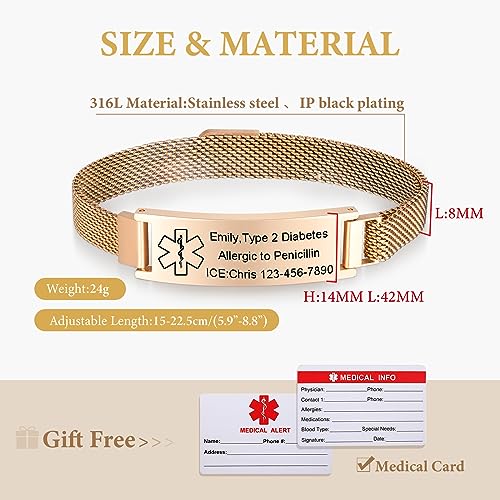• Medical Bracelets Size: Width 0.4 Inches(12mm), Length 6-8.2 inches(150-215mm).this bracelet can be easily adjusted to fit both men and women comfortably. Material: 316L Stainless Steel Mesh Chain, Never Rust, Sturdy and Durable, High Quality.