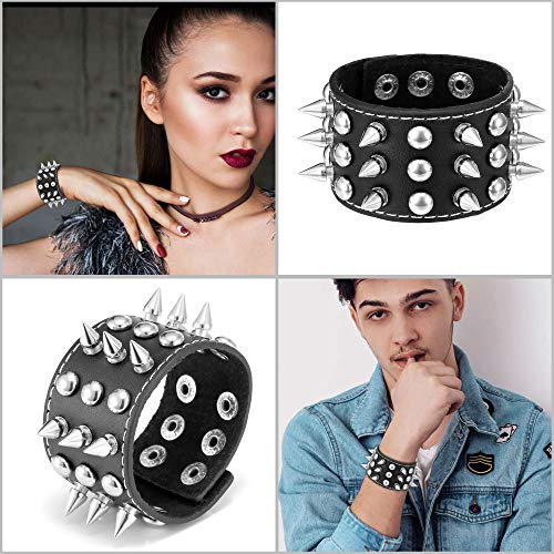 JOVIVI 3pcs Spike Studded Rivets Punk Rock Biker Wide Strap Genuine Leather Bracelets Necklace Chain Wristband Adjustable 4