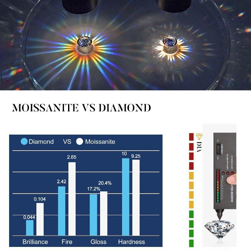• MOISSANITE: Moissanite is not a substitute for diamonds, but a gemstone more beautiful than diamond. When you’re looking at a diamond, you’ll notice both brilliance (white flashes) and fire (colored flashes). Moissanite also shows both, but typically has more fire than diamond. So, moissanite tends to have more colored flashes of light than diamond.