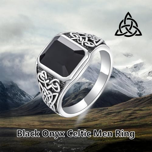 • 1. Black Onyx Celtic Knot Ring: Eternal Heritage. Featuring the sacred Trinity Knot, this ring embodies unity, strength, and spiritual connection. Centered with a polished black onyx stone—revered for protection and resilience—it merges ancient Celtic symbolism with masculine elegance. A timeless piece for men who honor tradition.
