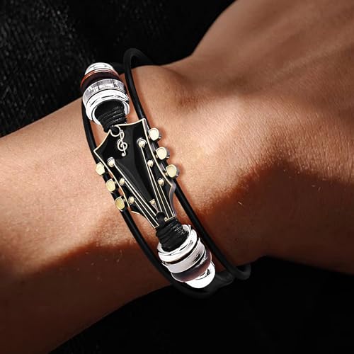 Retro Guitar Leather Bracelet for Man Women Unique Bead Braided Handmade Ethnic Tribal Cuff Multi-Layer Cords Wrap Music Shape Punk Rock Jewelry Gifts Wristband 5