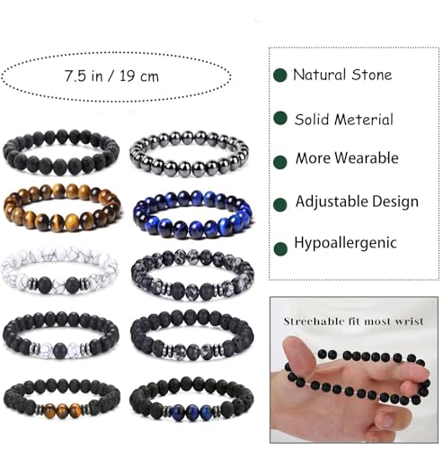 10PCS Mens Beaded Bracelets Set 8MM Tiger Eye Lava Stone Stretch Natural Stone Bead Bracelet Bulk Adjustable Black Crystal Stretch Bracelet for Men Gifts 5