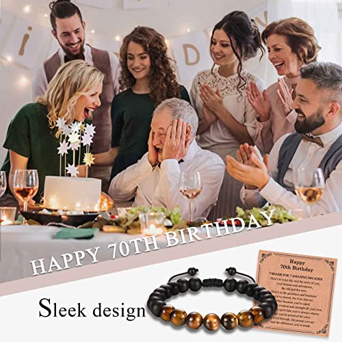 • 70th Birthday Bracelet: This bracelet is made with black agate stone and tiger eye stone, which is said to promote grounding, provide protection from negative energy and bring strength and courage to the wearer. So why wait? Pick one and get ready to see his face light up with joy.