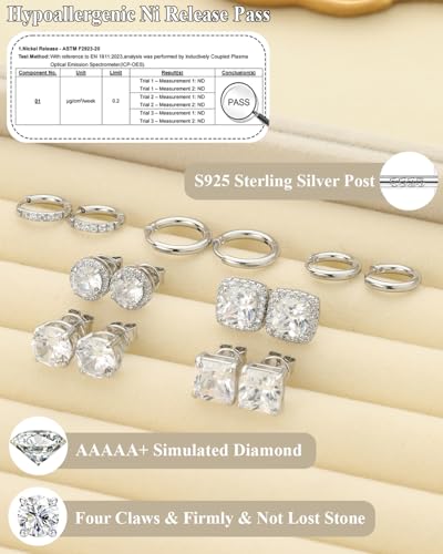 HOT ! Surgical Steel Stud Earrings for Men Women, S925 Sterling Silver Hypoallergenic Cubic Zirconia Earrings Studs & Hoops Set, Big Brilliant Simulated Diamond CZ Halo Stud Earrings for Sensitive Ears