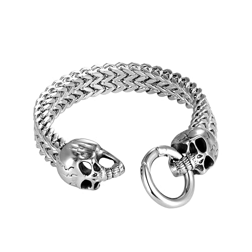 More information about Men’s Stainless Steel Skull Bracelet – Heavy-Duty Ring Clasp, Foxtail/Franco Link Chain, Tarnish-Resistant – Gold or Silver, Biker Punk Rock Style Jewelry, Gift for Him
