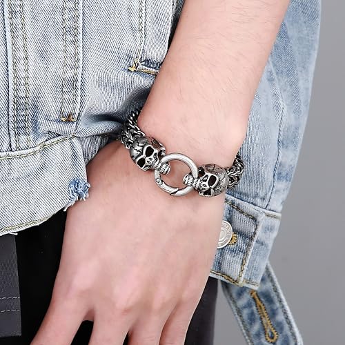 Men’s Stainless Steel Skull Bracelet – Heavy-Duty Ring Clasp, Foxtail/Franco Link Chain, Tarnish-Resistant – Gold or Silver, Biker Punk Rock Style Jewelry, Gift for Him 7