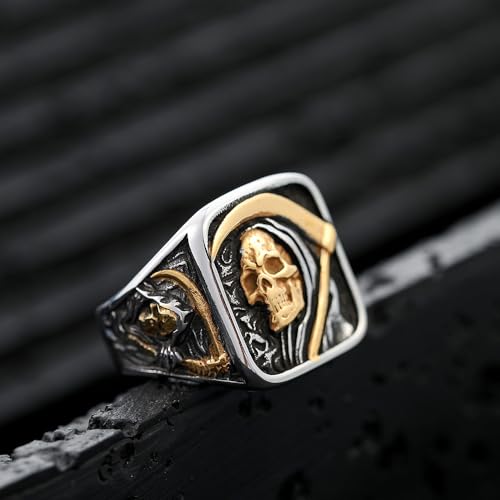 HOT ! Grim Reaper Ring for Men – Gold Skull with Scythe Signet Statement Ring, Death Biker Punk Stainless Steel Jewelry