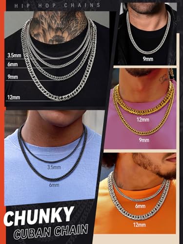 • Multiple Size Options: Choose from 3.5mm, 6mm, 9mm, or 12mm widths and 18"-30" lengths for the perfect fit. The robust lobster clasp ensures secure wear. This miami cuban link chain for men is perfect for layering or solo wear.