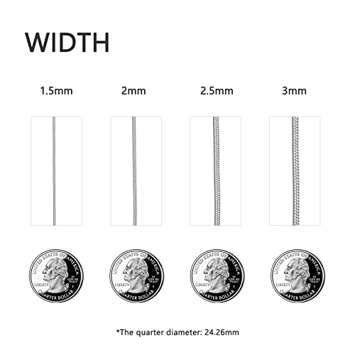 • 【 EXCELLENT QUALITY 】 The flexible and comfortable snake chain necklace made of 925 sterling silver, tarnish resistant, hypoallergenic, nickel-free, lead-free, cadmium-free and does not contain any allergic element, it won't change color and get dark for lifetime wearing. The width of the chains includes: 1mm, 1.5mm, 2.0mm, 2.5mm, 3mm, and the length is 16-26 inches.