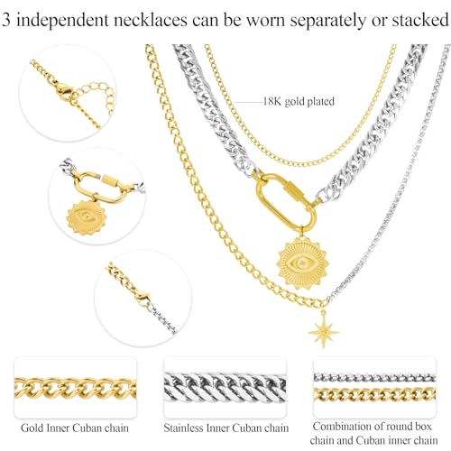 HOT ! Gold Silver Layered Necklaces for Women 3 Set,Chunky Two Tone Necklace Evil Eye Pendant Paperclip Cuban Link Stacked Chain Trendy Statement Jewelry Gift Women Men
