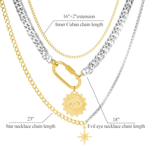 • 【Layered Necklaces Size And Package】: Size: Inner Cuban chain length: 16“+2”extension,Star necklace chain length: 23", Evil eye necklace chain length: 18", The layering necklace includes 3 set of trendy cuban links and round box chains. You can wear one or all or match them with your pendants and jewelers. They can be versatile items matched with any makeup and dress-up.