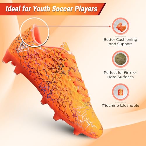 • LIGHTWEIGHT COMFORT FOR ALL-DAY PLAY: Engineered for soft, lightweight comfort—your child can run, kick, and play without complaining of tightness or bulk. Soft interior lining and cushioned insoles keep kids soccer shoes and youth soccer cleats boys happy on and off the field.