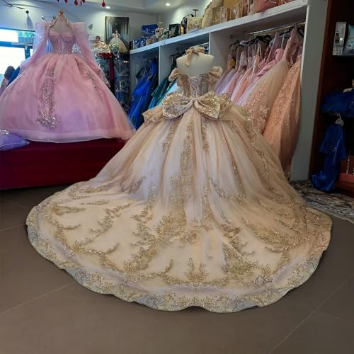 More information about Mauuwy Sparkly Gold Applique Quinceanera Dresses Layered Tulle Sweet 15 16 Dresses Beaded V Neck Bow Dress with Tassel