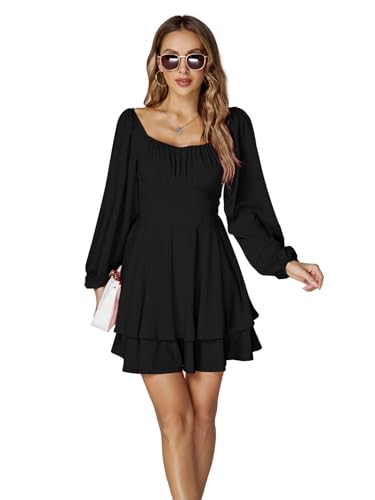 HOT ! LYANER Women's Lantern Long Sleeve Wrap Tie Back Square Neck Double Layer Ruffle Hem A Line Short Mini Dress
