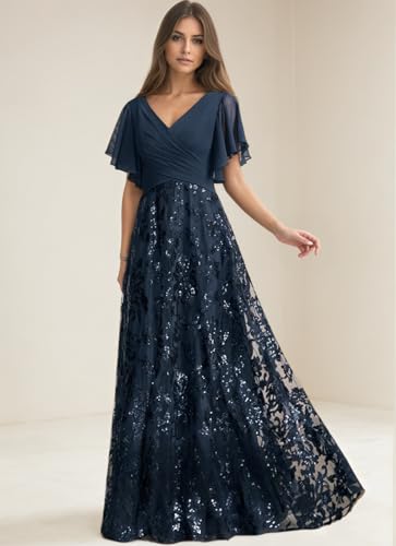 • Sequin Mother of The Bride Dress for Wedding Guest Lace Appliques Chiffon Formal Evening Dresses with Short Flutter Sleeve