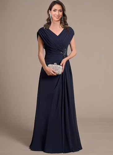 HOT ! Cap Sleeves Mother of Bride Dresses for Wedding Sparkly Beaded Ruched V Neck Chiffon Evening Dress for Women