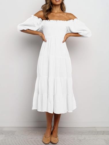 R.Vivimos Women's Summer Cotton Lantern Sleeves Ruffled Off Shoulder A-Line Midi Dresses 6
