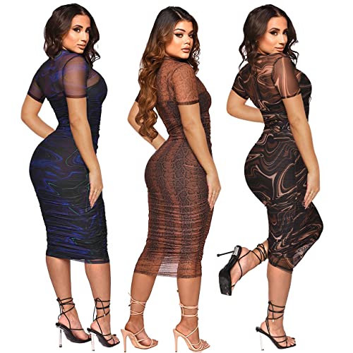 MOEENCN Sexy Long Sleeve Midi Dress for Women Sheer Mesh Printed 2 Piece Skirt Set Crew Neck See Through Bodycon Clubwear 3