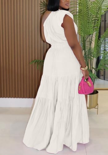 Women's 2025 Linen One Shoulder Dresses Summer Casual Sleeveless Flowy Ruffle Beach Vacation Maxi Dress 4