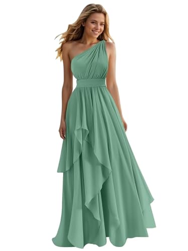 More information about A Line One Shoulder Bridesmaid Dresses for Wedding Ruffles Chiffon Long Formal Evening Party Gowns with Pockets