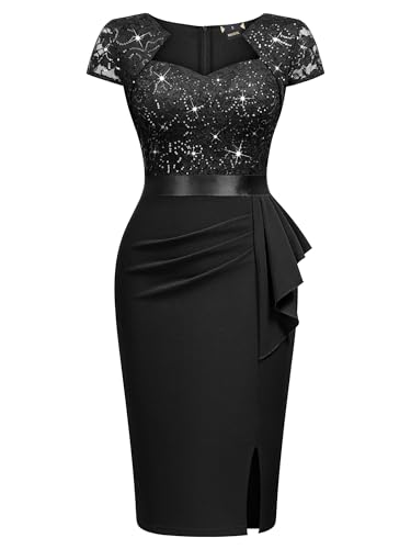 • Design: This sparkle slim dress features a lace contrast design. The sequin lace square neckline design adds a touch of retro and elegance to the dress. The lower part of the dress is made of stretchy fabric, the ruffle detail at the waist adds a nice retouching effect.