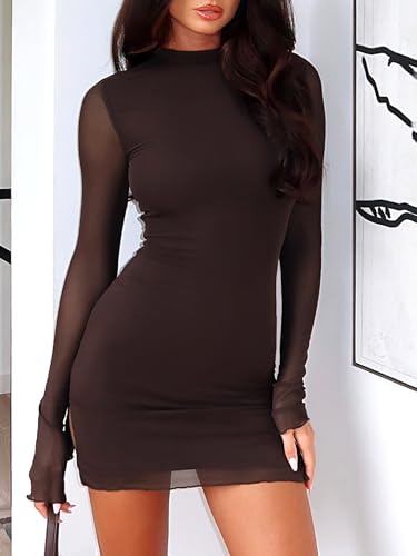 HOT ! Women Long Sleeve Bodycon Mini Dress Mock Neck Sheer Mesh Slit Going Out Dress Fall Rave Club Cocktail Party Dresses