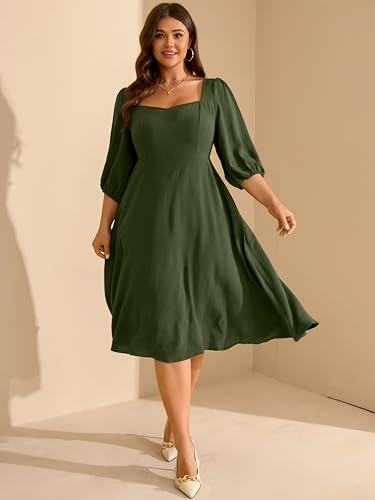 HOT ! RWJ Plus Size Dress for Women Fall 3/4 Sleeve Sweetheart Neck Aline Casual Wedding Guest Formal Midi Dresses with Pockets