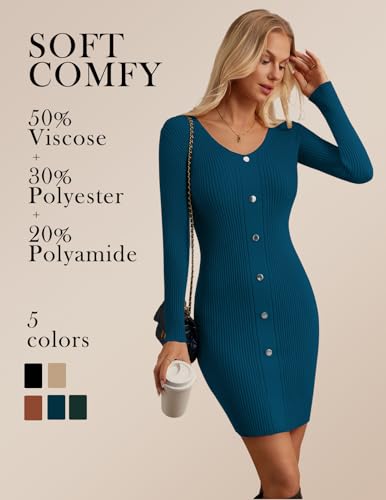 • Design: Women's knit sweater dress has classic solid color, bodycon, sexy V-neck, ribbed long sleeves, decorative buttons on the front, and knee length. This stylish fall winter 2025 sweater dress combines both sexiness and elegance.