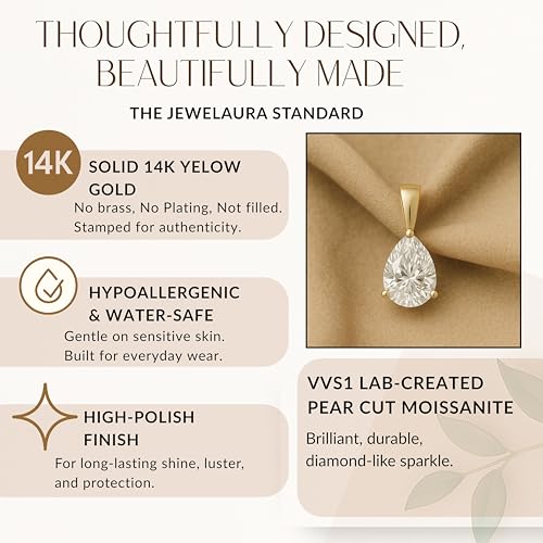 • New to Our Collection: This stunning Pear-Cut Moissanite pendant necklace showcases a 8x6 mm lab-created Moissanite, equal to a 1.25 carat diamond weight (DEW), set in a solid 14K yellow gold 3-prong setting with a secure bail. Paired with a classic 14K yellow gold box chain, the elegant teardrop shape creates a flattering, subtle slimming effect, while VVS1 clarity, D color, and excellent cut deliver radiant brilliance.