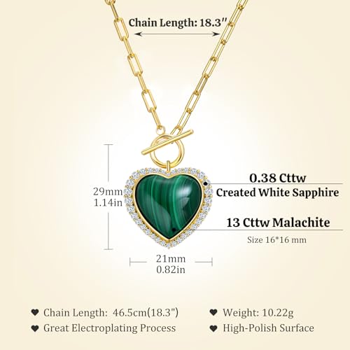 • Malachite Necklace for Women: Malachite gemstone necklace features a vibrant 16 x 16 mm heart-shaped natural green malachite crystal, encircled by a halo of sparkling created white sapphires for a luxurious, eye-catching design