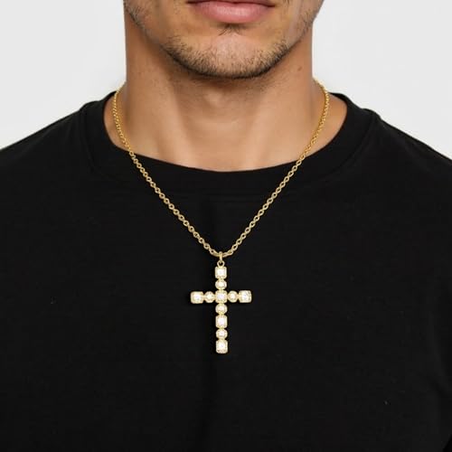 • CROSS PENDANT ROPE CHAIN NECKLACE: Handcrafted in brass metal of high quality, 14K gold plated with AAAAA cubic zirconia gemstones, ensuring long-lasting brilliance and durability. The Baguette and round cut cross Necklace is great way to share your faith