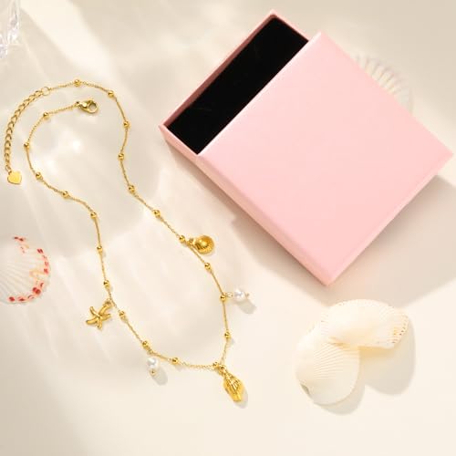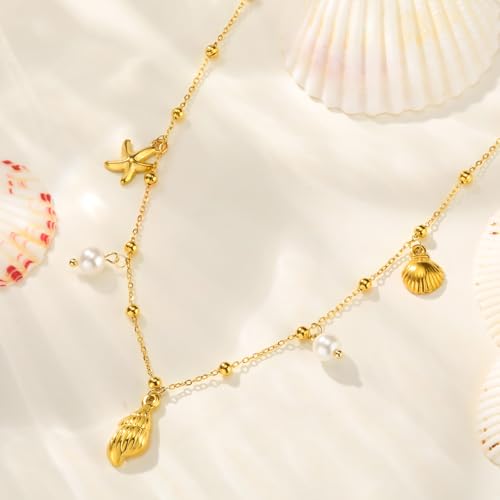 • Gold Shell Necklace for Summer:Our seashell charm necklace captures the sea's beauty. Featuring dainty shells, starfish and pearls as pendants, it adds a unique touch to any summer outfit. Great for beach vacations.Whether worn alone or paired with other jewelry,this lightweight necklace ensures comfort and style
