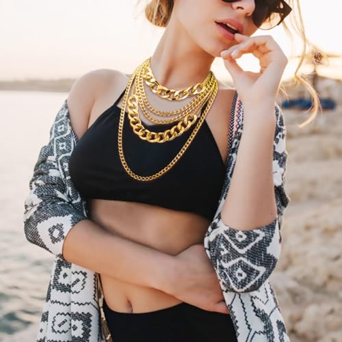 HOT ! Chunky Gold Necklaces, Punk Gold Layered Necklaces for women, Hip Hop Outfit Accessories Statement Necklace for 80s 90s Party