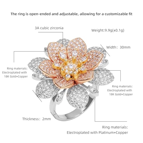 Aura & lrena Statement Flower Ring for Women, 18K Gold Plated Adjustable Open Band Cocktail Ring, 3D Floral Zirconia Fashion Jewelry, Bold Elegant Ring Gift 5