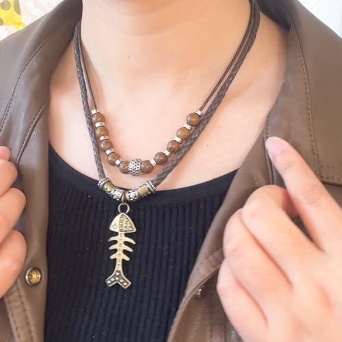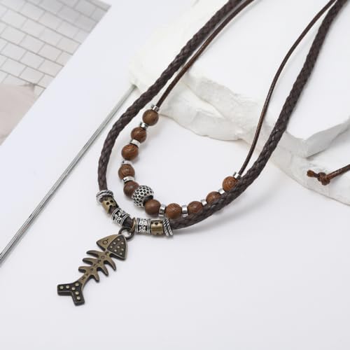 Leather Men Necklace Double Layers Braided Tribal Vintage Style Necklace Boho Hipppie Beaded Artificial Fish Bone Pendant Necklace for Christmas Gift 4