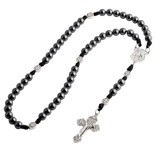 • HanlinCC Hematite Stone Beads Handmade Saint Michael Paracord Rosary Necklace , it is use 10mm hematite stone beads for the hail mary beads, the Glory Beads is 8x10mm Anti-Silver Cross metal beads; the rosary length is 52cm (20.5 inches), rosary unit weight is 170 grams (0.38 lbs), the rosary are handmade by Parcord, large and heavy, it makes rosary very strong and stunning;