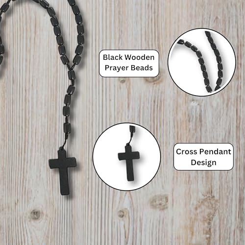 • Solid, black wood rosary beads with cross Catholic necklace. Handcrafted in Brazil by artisans with love and devotion. These black wooden beads and cross are naturally treated, and knots are tied sturdy. This rosary is extremely durable and will last a lifetime.