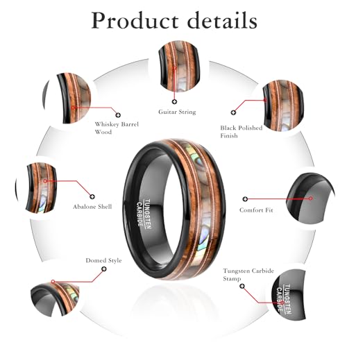 NUNCAD Tungsten Rings for Men Whiskey Barrel Wood and Abalone Shell Inlay Black Engagement Wedding Band Guitar String Ring Comfort Fit Size 7-12 1