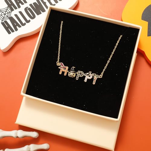 Gold Halloween Charm Necklace 14K Gold Plated Cute Enamel Bat Witch Hat Pumpkin Pendant Necklace HAPPY HALLOWEEN Letter Necklace Adjustable Fun Halloween Costume Party Jewelry Gift for Women Men 5