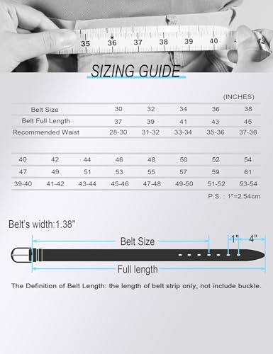 • [Perfect Fit]: Crafted with seven reinforced holes, this leather belt effortlessly adapts to various waist sizes. Moreover, to optimize comfort, order one size larger than your waist size. Finally, explore our sizing chart for the perfect fit tailored to you.