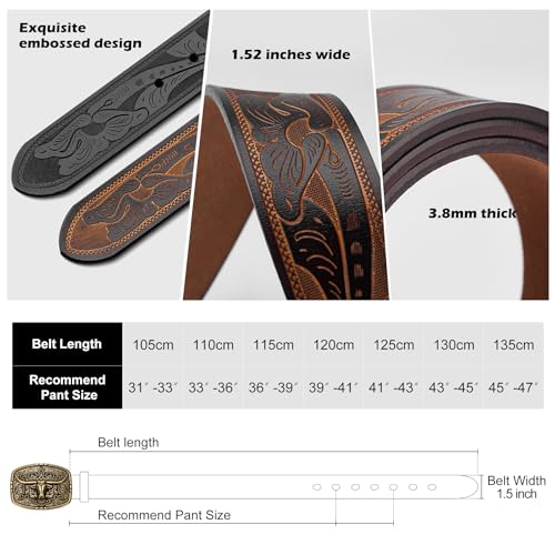 • Material:Made from top quality cowhide, with western style embossed pattern,comfort and durable for many years use.After time and use, the leather will be more unique and beautiful.The width of the blet is 3.8 inches.