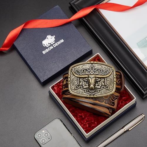 BISON DENIM Men's Western Cowboy Belt with Big Printed Engraved Buckle Strap Adjustable 3