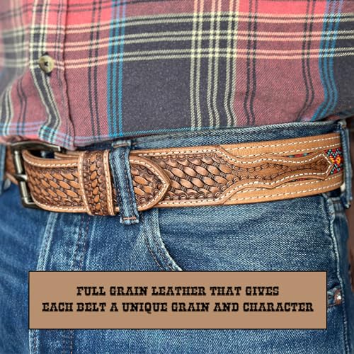 HOT ! DANIEL'S ARTPLANET Western Belt for Men Handmade Full Grain Leather Beaded Tooled Cowboy Belt with Removable Buckle 1.5”