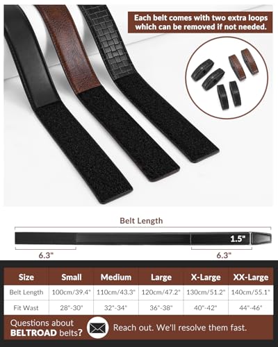 • Easy Fit Adjustment: The 1.5" buckless belt’s adjustable Hook and Loop Mechanic Belt (no holes, no hassle!) comes in 3 styles and 5 sizes. Fits waist sizes effortlessly, including 2 free extra belt loops (optional spare). Dress the buckleless belt up with chinos or pair it with work jeans.