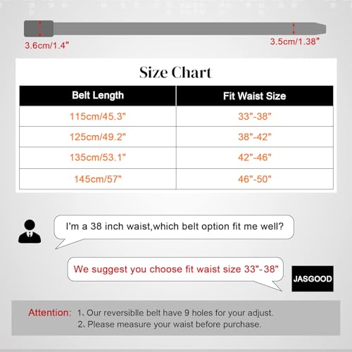 • Reversible Feature Belt : JASGOOD mens reversible leather belt made of high-quality leather and has a rich, smooth finish. Makes this fashion dress belt very sustained and sleek. It’s can be a men dress belt, casual dress belt to match men jeans, dress pants, suits,slacks.